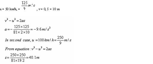 Q18. A car moving with a speed of 50 km/h can be stopped by applying brakes after at least 10 m. What will the minimum stopping distance if the same car is moving at a speed of 100 km/h?