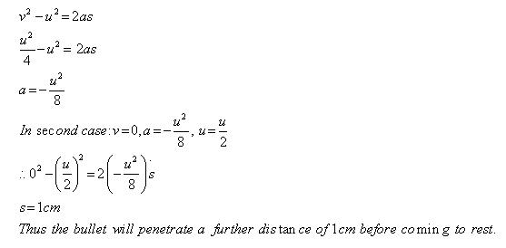 Q28. A bullet fired into a fixed target loses half of its velocity after penetrating 3 cm. How much further will it penetrate before coming to rest?