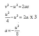 Initial velocity = u and acceleration = -a final velocity = 0 Therefore, applying