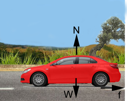 (iii) Frictional Force, f in the direction opposite to the direction of motion.